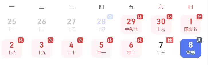 中秋,國(guó)慶放假時(shí)間:9月29到10月7日,共計(jì):放假9天,10月8日正是上班。